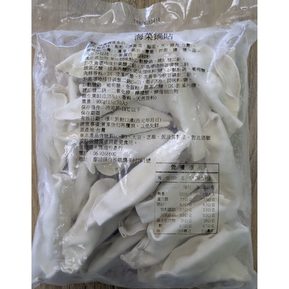 成分:麵粉、高麗菜、澎湖野生海菜、水、豬肉(台灣)、豬絞油(台灣)、薑母、麻油、青蔥、洋蔥、鹽、糖、蒜、大豆沙拉油、小麥蛋白、胡椒粉
